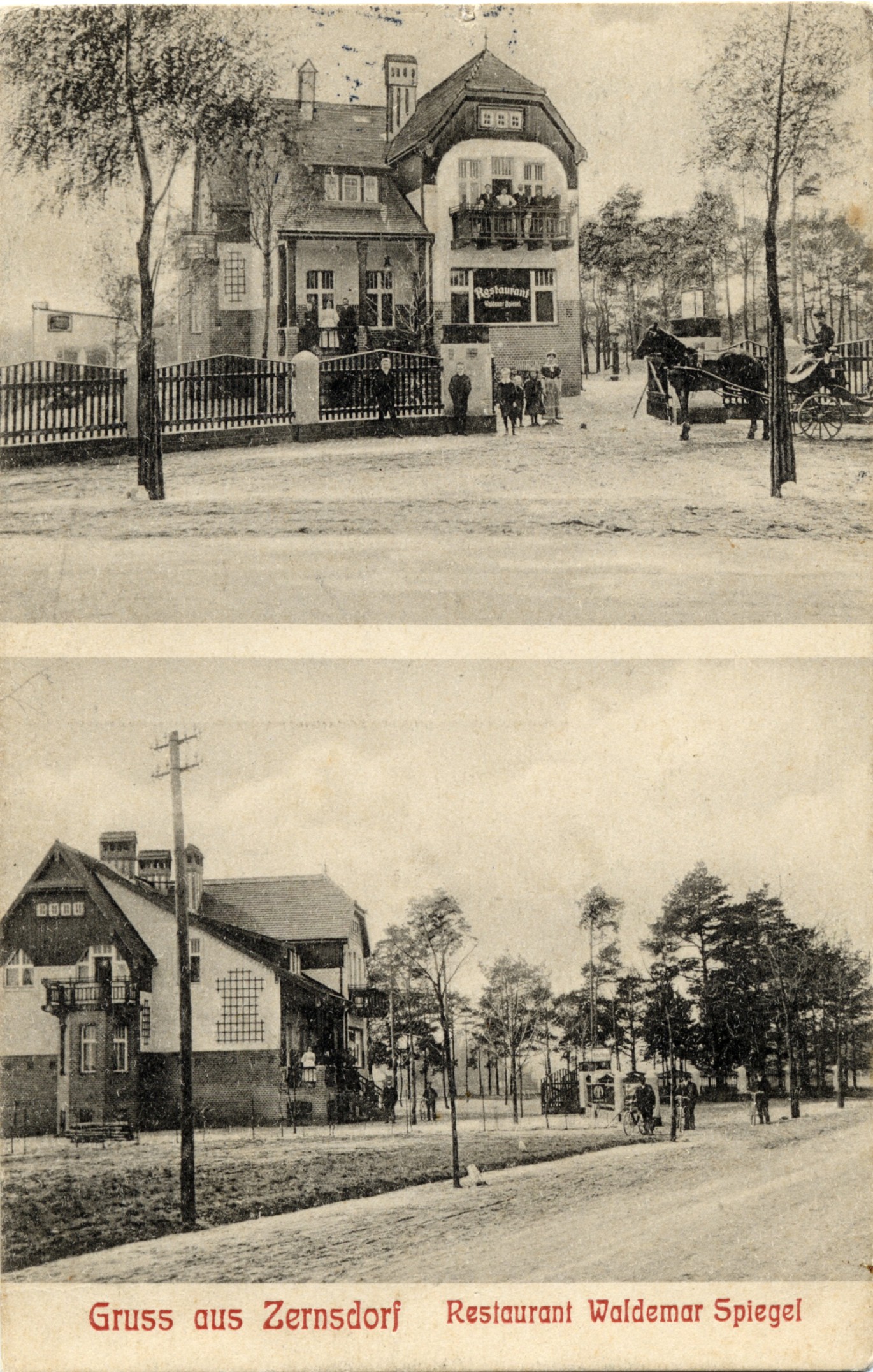 Auf dem Reißbrett des Arthur Spiegel entstand 1908 die "Zeichnung zu einem Landhauses in Zernsdorf bei Königswusterhausen, Herrn Waldemar Spiegel, daselbst wohnhaft, gehörig". Als handschriftliche Notiz wurde beigefügt: "Zum Conzessionsgesuch des Herrn Waldemar Spiegel", d.h. Antrag auf Erlaubnis des Führens einer Gasstätte. Das vollunterkellerte Landhaus war also von Anfang an als Restaurant konzipiert und hatte im Erdgeschoss zwei Gaststuben, eine weitere Stube, eine Kammer und die Küche. Im Oberschoss war der Wohnbereich: Anfänglich gab es hier zwei Wohnungen, da der Plan hier zwei Küchen aufweist.